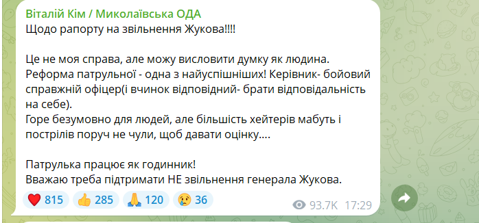 "Патрулька работает как часы! Считаю надо поддержать НЕ увольнение генерала Жукова ", — написал Ким.