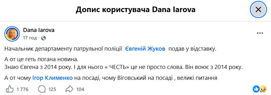 Дана Яровая, известный украинский волонтер, пишет, что решение Жукова подать в отставку — плохая новость.