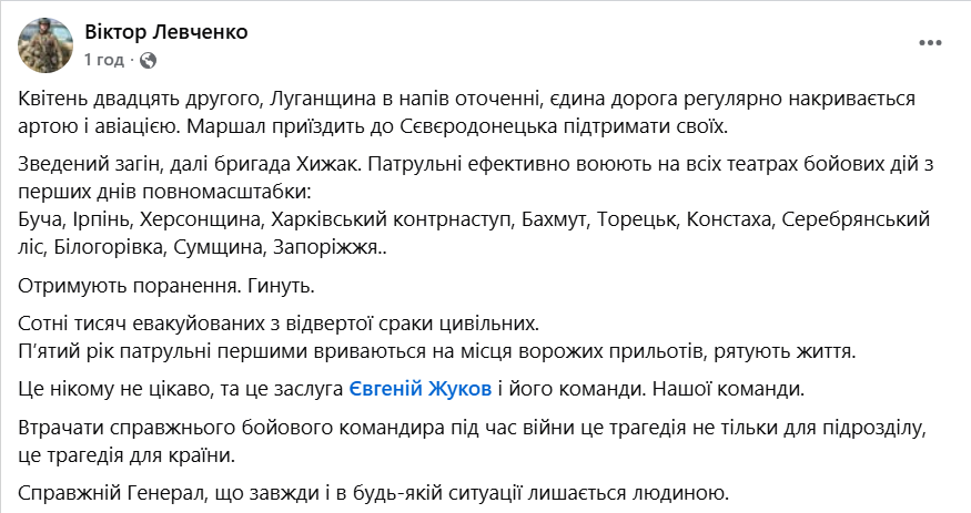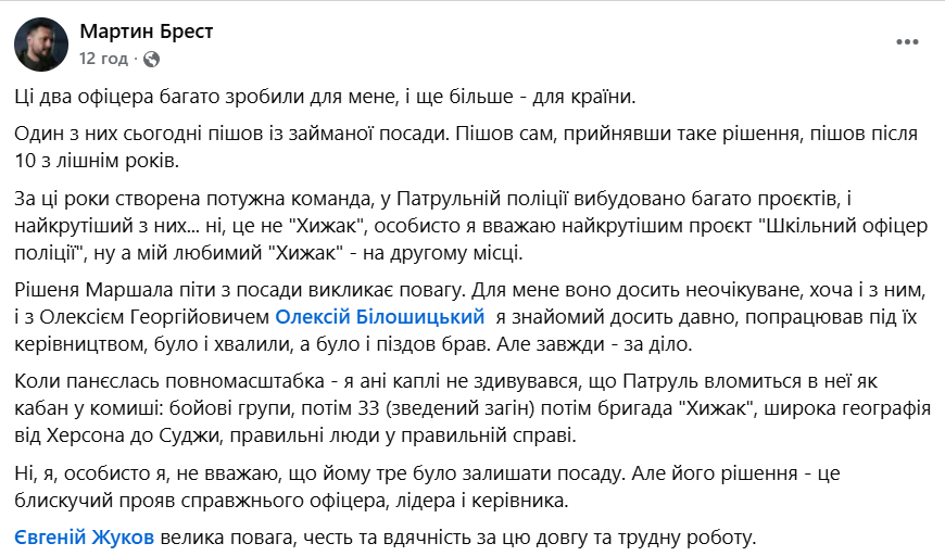 "Потому что позывной Маршал, был и является шансом для "патрульки". По многим причинам: потому что он не из гнилой системы МВД, потому что он боевой офицер десанта, потому что он неоднократно делал правильные вещи, потому что он готов был рисковать (кто знает застройки Киева весны 22-го, тот понимает, о чем я понимаю, — о чем я говорю, — о чем я говорю "), — написал журналист.
