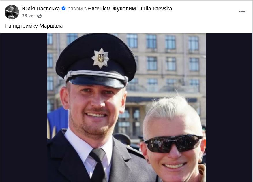 "Телеграф" собрал реакции известных украинцев на решение Жукова. Юлия Паевская "Тайра" — одна из самых известных украинских военнослужащих, волонтеров и парамедиков опубликовала совместное фото с Жуковым. Она сделала краткую подпись "В поддержку Маршала".