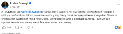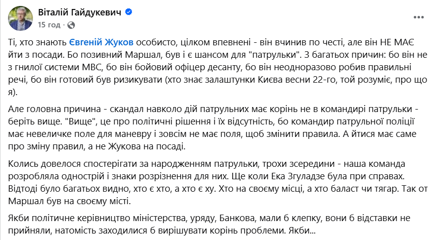 Виталий Гайдукевич — известный украинский журналист, телеведущий, публицист и общественный деятель пишет, что лично знающие Жукова уверены — он поступил по чести, но он не должен уходить с должности.