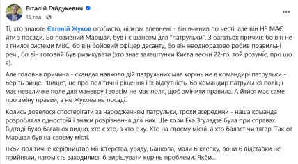 Однако главная причина в том, что на самом деле командир патрульной полиции имеет небольшое поле для маневра, и не имеет возможности менять правила. По мнению Гайдукевича, корень проблемы в отсутствии политических решений. Он резюмировал, что "речь должна именно об изменении правил, а не Жукова в должности".
