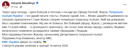 Наталья Мосейчук (журналистка) пишет, что Жуков не должен покидать должность "из-за одного выродка и двух трУсов в погонах".