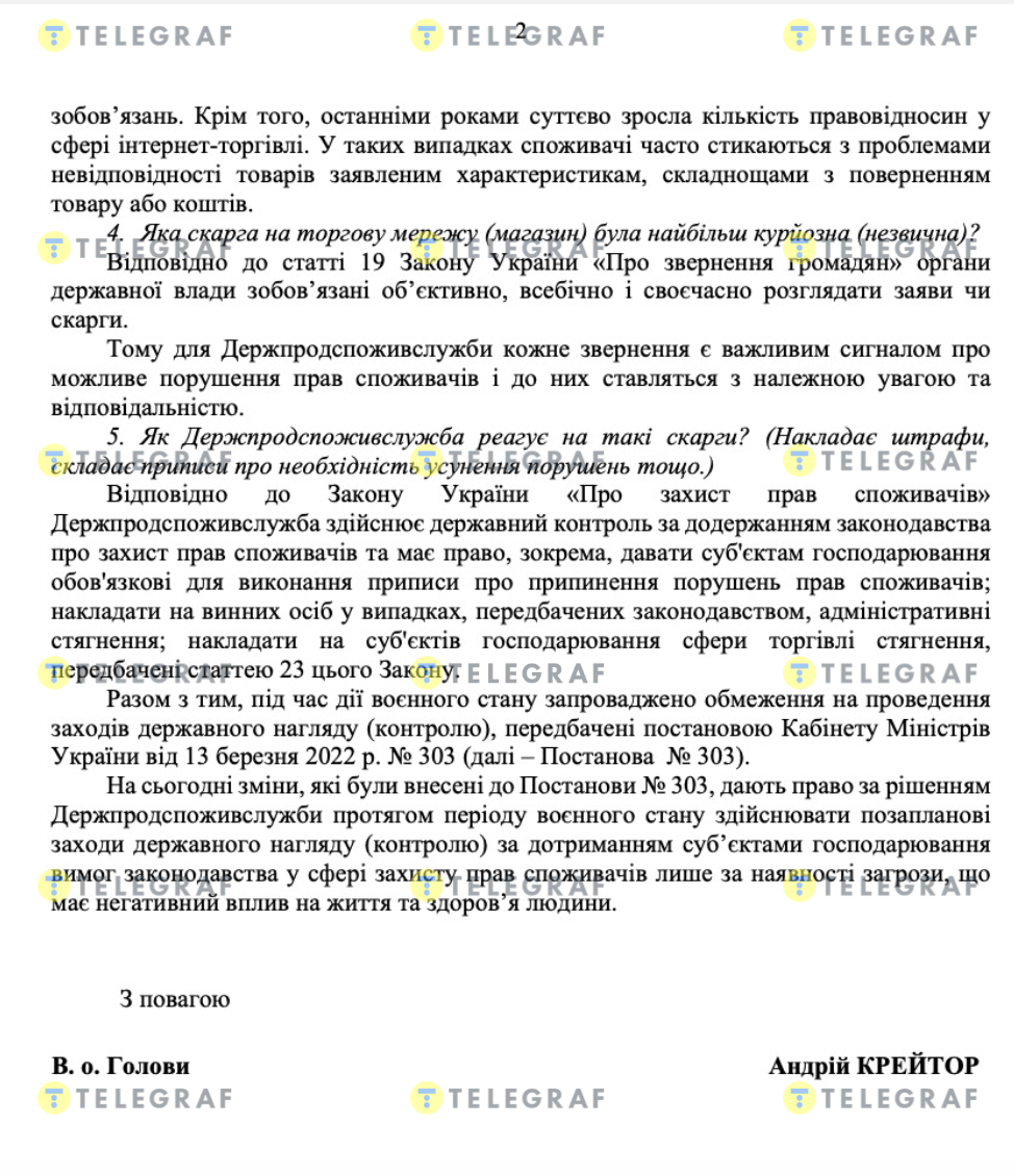 Ответ Госпродпотребслужбы