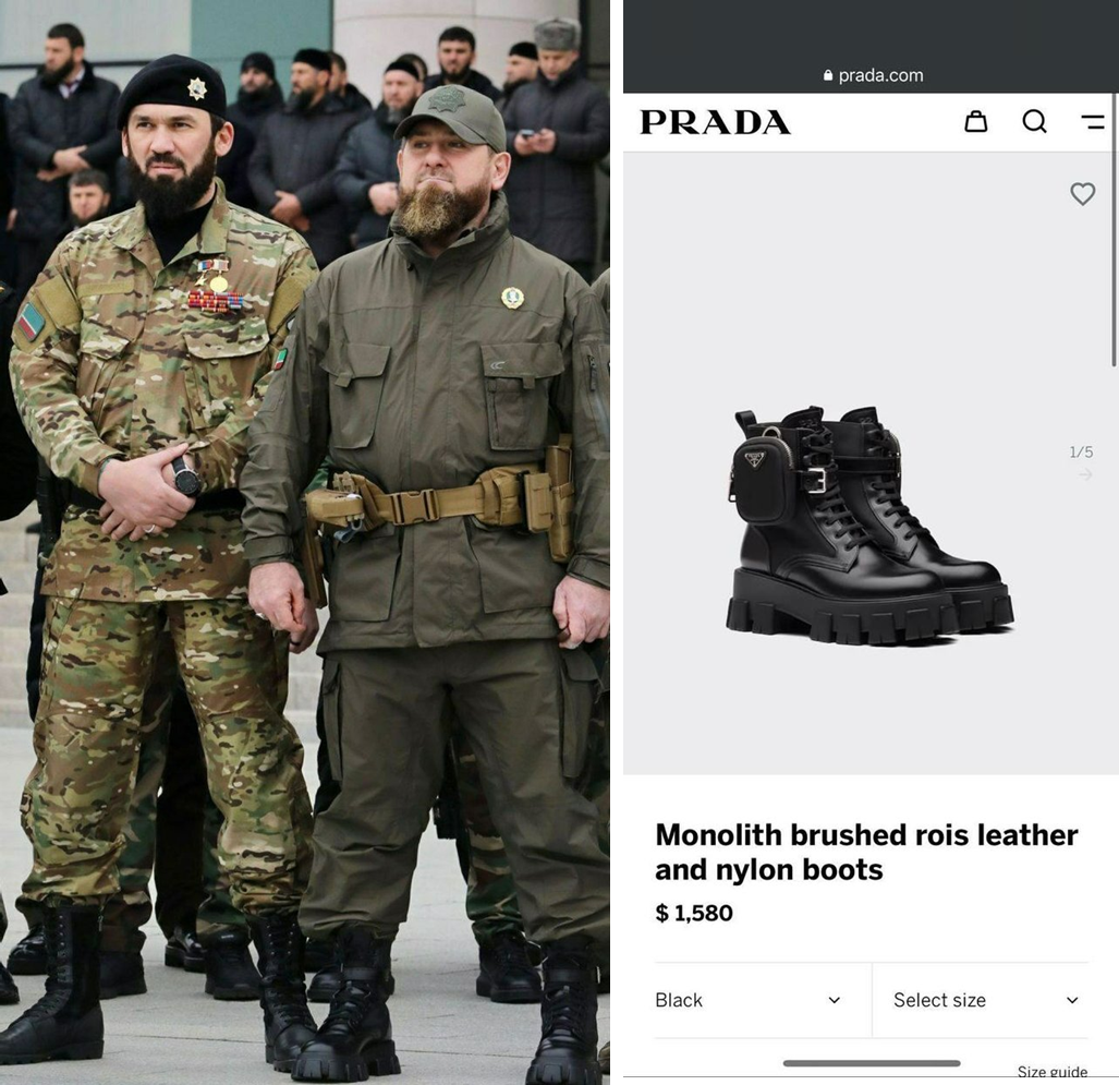 В соцсети Threads опубликовали фото с Кадыровым, на которых видно, что он щеголяет в массивных черных ботинках от бренда Prada. Все бы ничего, но оказалось, что это женская модель ботинок Prada Monolith.