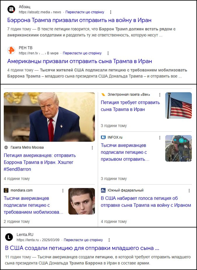 В частности, госагентство РИА Новости писало: "Тысячи американцев требуют призвать младшего сына президента США Дональда Трампа Беррона в армию для отправки в Иран". Это медиа и ряд других ссылались на петицию, ведущую на сатирический сайт с вымышленными цитатами, созданный бывшим сценаристом "Южного парка".