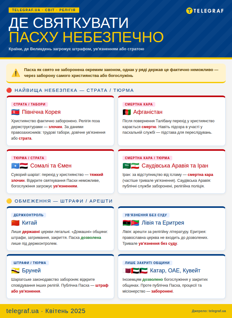 "Телеграф" решил рассказать о государствах, где отмечать Пасху опасно. Хотя сам праздник не запрещен отдельной нормой закона, однако фактически это невозможно сделать из-за запрета на само христианство или проведение богослужений.