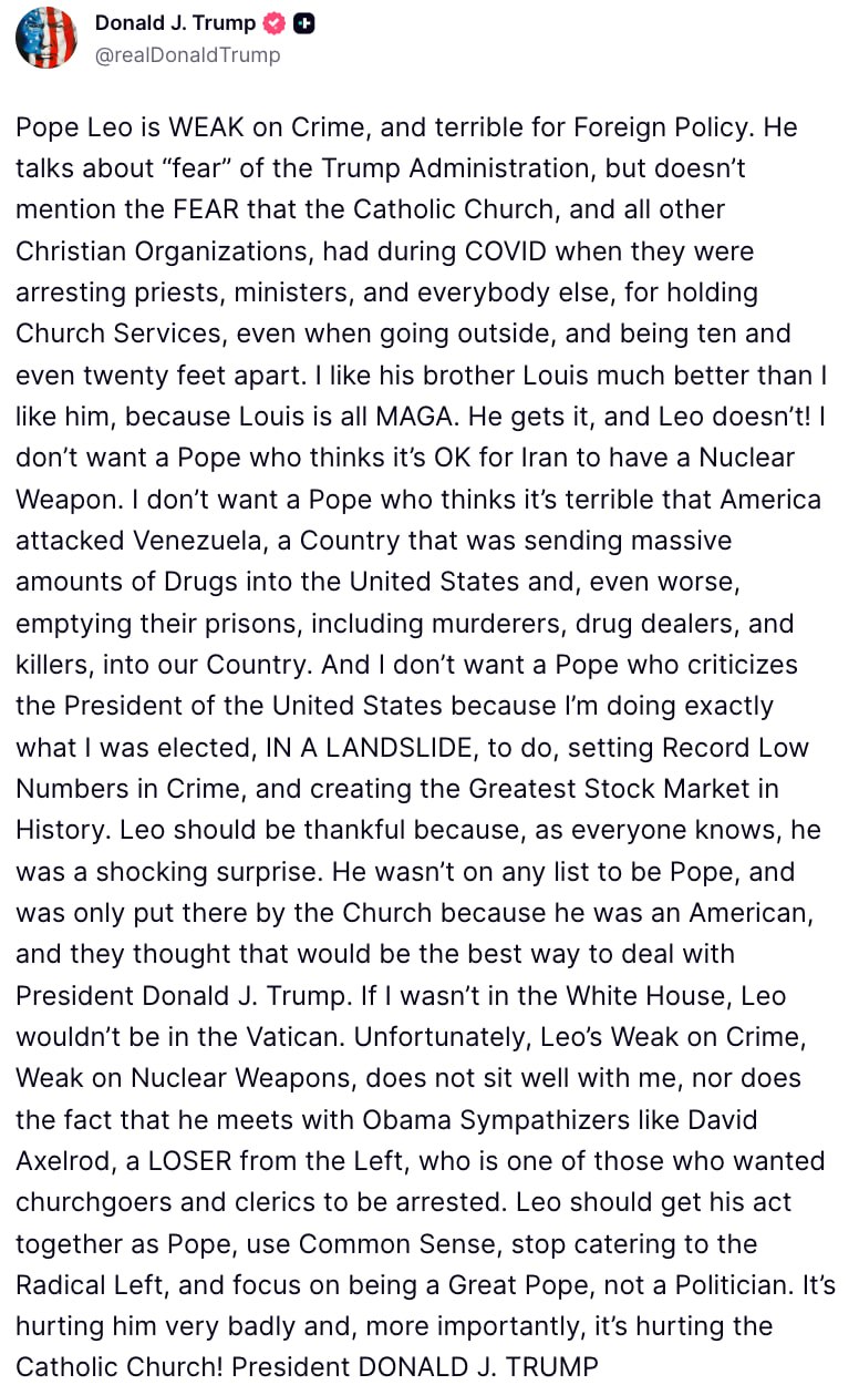 "Папа Лев слаб в вопросах преступности и ужасен во внешней политике. Мне его брат Луи нравится гораздо больше, чем он сам, потому что Луи полностью за MAGA. Он все понимает, а Лев – нет!